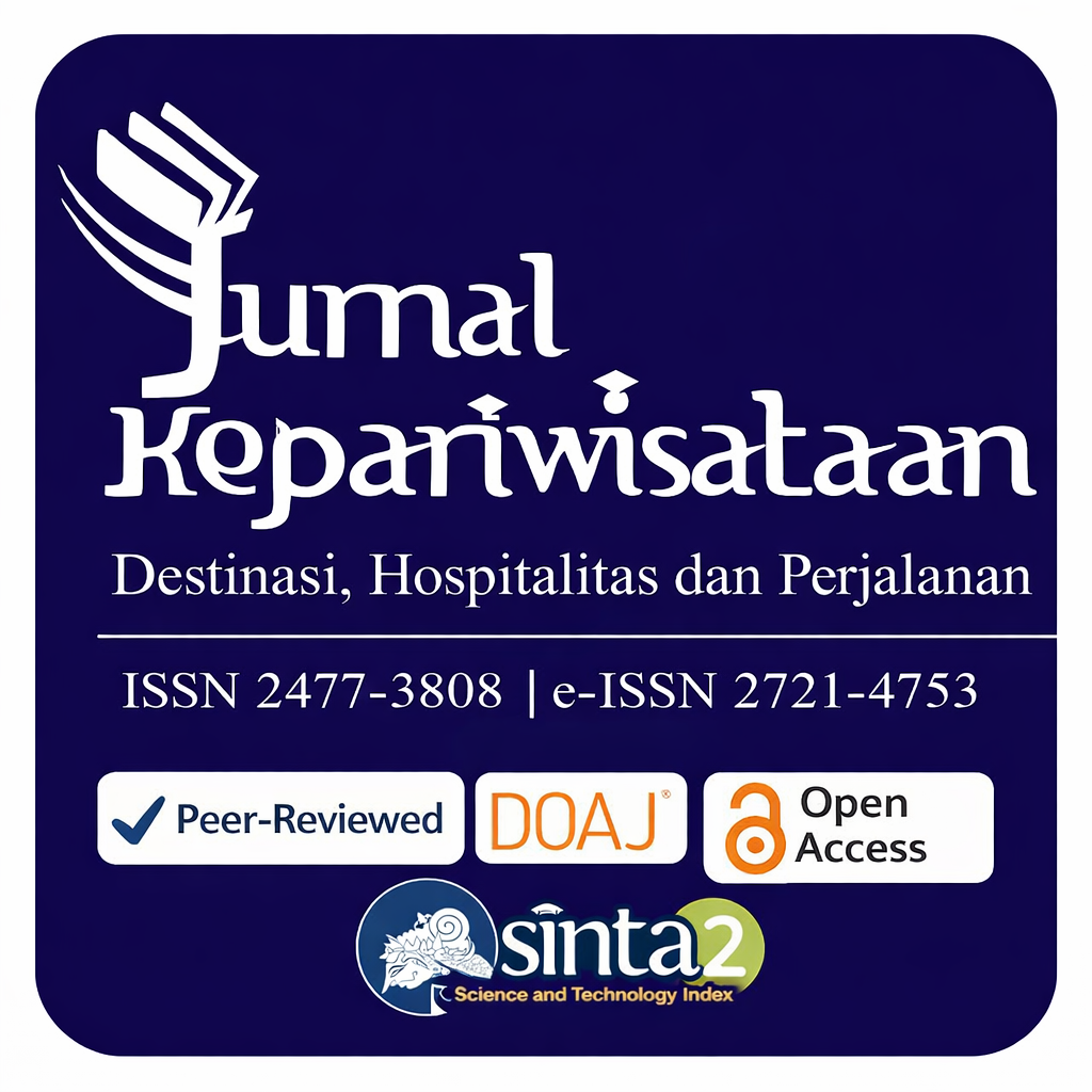 Volume 9, Number 2 (2025) of Jurnal Kepariwisataan: Destinasi, Hospitalitas dan Perjalanan features ten peer-reviewed articles authored by 30 scholars, presenting contemporary research and applied studies in hospitality and tourism. This issue reflects the journal’s commitment to advancing theoretically grounded and practically relevant knowledge, particularly within the Indonesian tourism context. A significant portion of the articles addresses destination development and management, including strategies to enhance tourist safety, feasibility assessment models for tourism villages, and analyses of destination attributes influencing Indonesian travel behavior. These studies offer valuable insights for destination managers and policymakers in improving competitiveness, safety, and sustainability. The issue also highlights tourist behavior and experience, with articles examining the effects of nature-based tourism on tourists’ mental health and revisit intentions, the influence of homestay attributes in tourism villages, and future behavioral models based on perceived value and culinary experiences. These contributions underscore the importance of experience quality and value creation in shaping tourist loyalty. In the domain of hospitality and service management, one article explores the relationship between employee personality, customer orientation, and customer incivility, providing implications for human resource management and service quality improvement. Responding to the growing role of digital platforms, several studies focus on tourism marketing and digital promotion, including the role of influencers in promoting Indonesian tourism destinations and the strategic use of Instagram engagement through a destination-based case study. These articles emphasize digital communication as a key driver of destination branding in the contemporary tourism landscape. Culinary tourism also emerges as a central theme, with discussions on culinary art and its purpose, as well as empirical analysis of culinary experiences as determinants of perceived value and future tourist behavior.