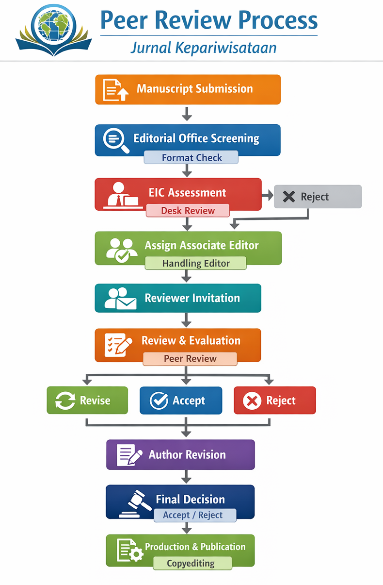 Jurnal Kepariwisataan implements a double-anonymized peer review process, ensuring that the identities of authors and reviewers are concealed throughout the review process.